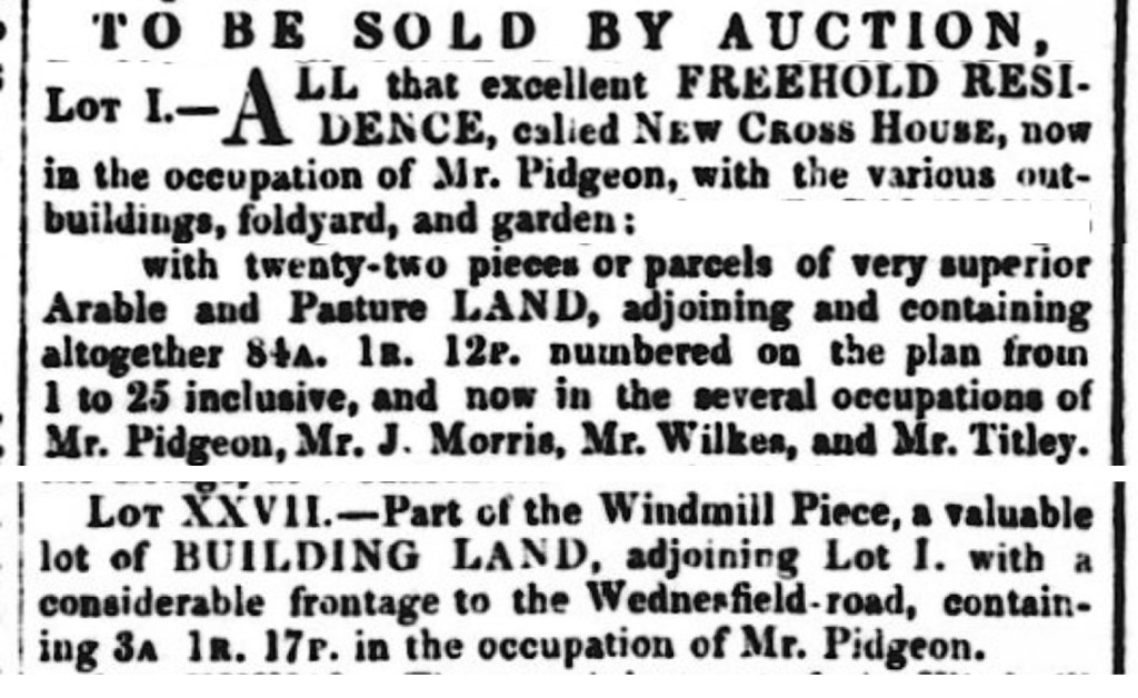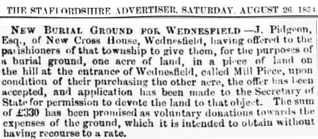 It is assumed that Mr Pidgeon purchased this land around 1846. He had originally been the occupier under the ownership of Richard Fryer, who died in 1844 passing the bulk of his estate to his son William Fleeming Fryer. The Wednesfield land/property in the New Cross area was put up for sale in 1846, citing Mr Pidgeon as the occupier of some of it, which he later offered for the new burial ground—part as a gift, part to be purchased, as per the newspaper article above.