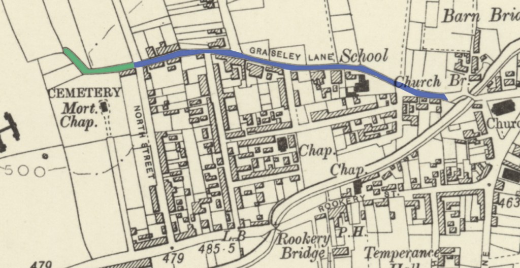 Graiseley Lane began at Church Bridge and ran relatively straight until it turned into a private lane that run along the rear of the oldest part of the cemetery. From there, it branched off in a northwesterly direction. A diagram in the 1855 Conveyancing of Land, instructed by landowner James Bartholomew Pidgeon, described the lane as going ‘from Wednesfield … to Lands’.